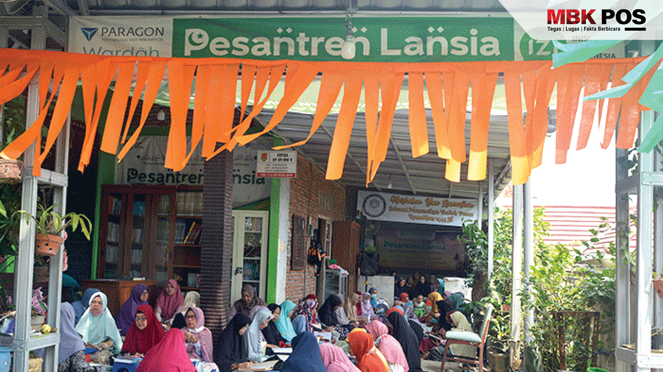 Ketika memasuki area pesantren, pengunjung akan disambut oleh gapura yang terbuat dari rangka aluminium dengan tulisan “Pesantren Lansia” yang terlihat jelas. Ada juga umbul-umbul berwarna-warni yang menghiasi area pesantren.